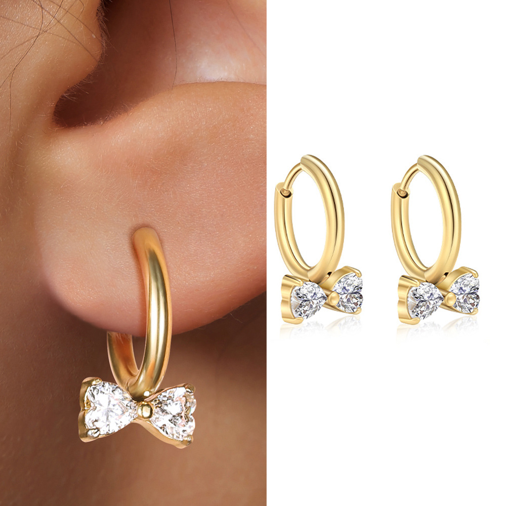 シンプルなラブリボンジルコンイヤリングステンレス鋼輝くジルコンガールスイートスタイルイヤリング多用途イヤリング