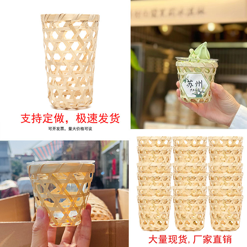 竹かご、竹編みミルクティーカップセット、手作り竹筒、小さな竹かご、アイスクリームカップ、竹かご、氷豆腐、綿氷、竹編みボウル