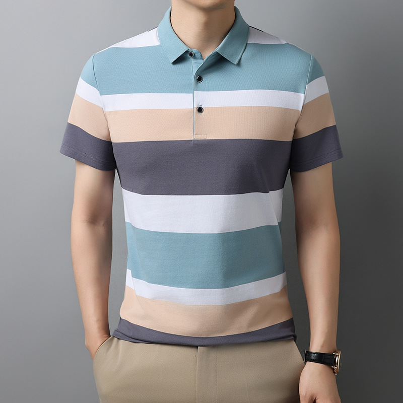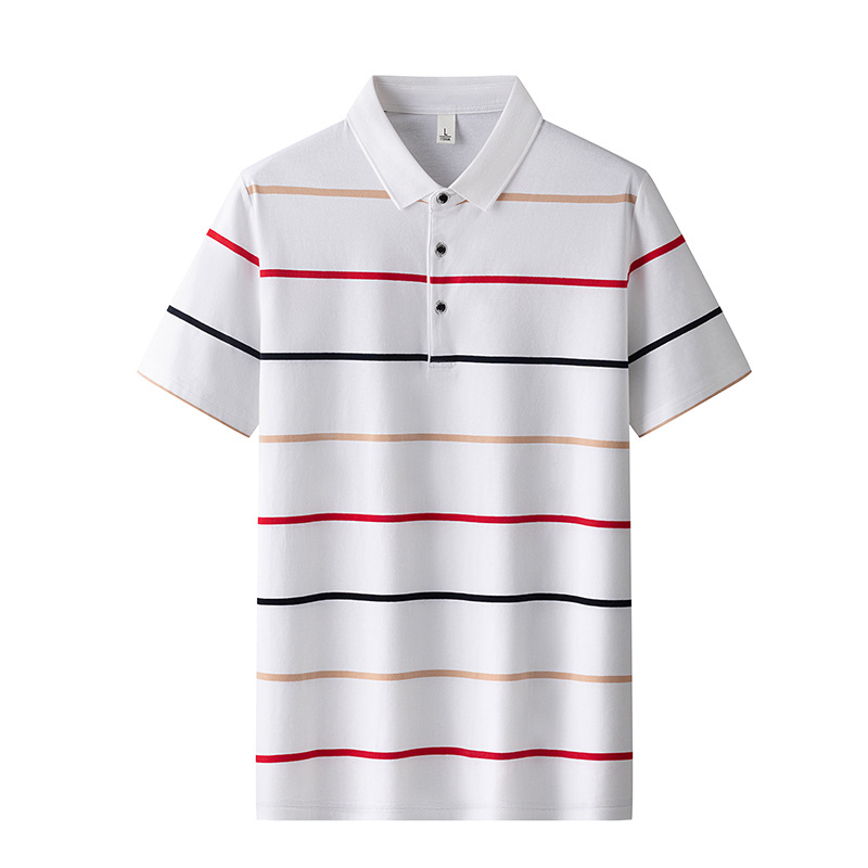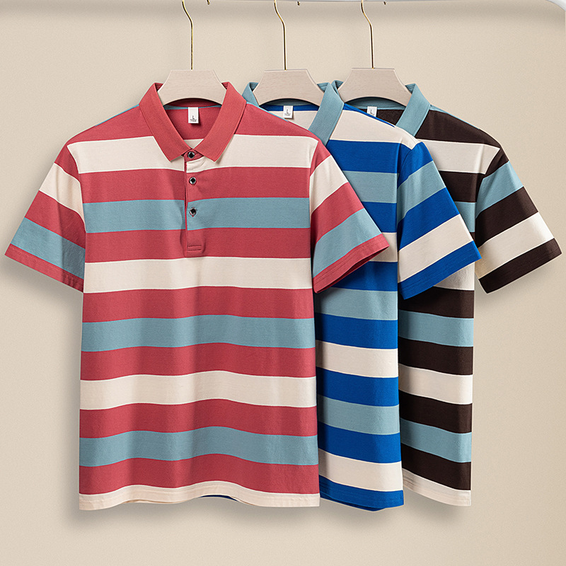 夏の新商品中高年男性用襟付き半袖tシャツストライプ綿質男性用襟付き半袖ポロシャツ卸売り