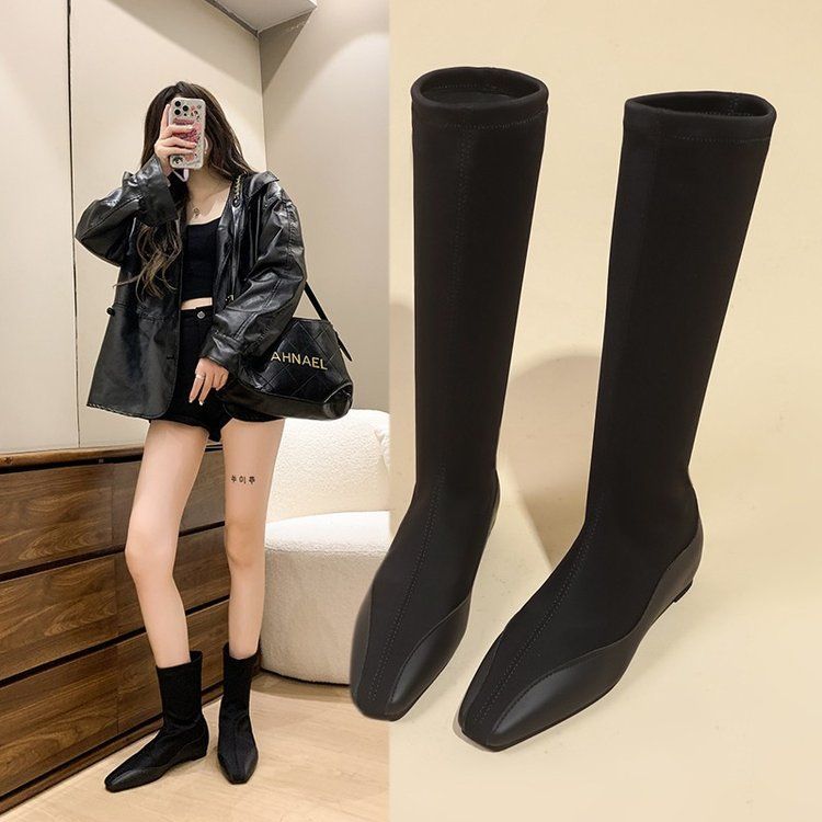 角頭高筒ブーツ女2024年新型秋冬騎士靴平底長靴弾力靴靴下靴積上げ靴