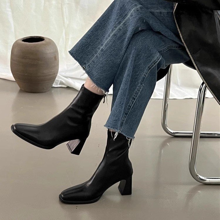 ハイヒール痩せ靴アンドロメダ風2024年秋の新型軟皮太とタバコ筒靴ネット赤ファッションチェルシーショートブーツ