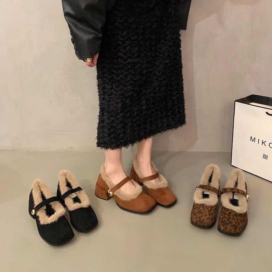 レトロな太さとベルベットの四角い靴の女性2025春秋の新しいベルベットのヒョウ柄のボタン付きメアリージェーン靴