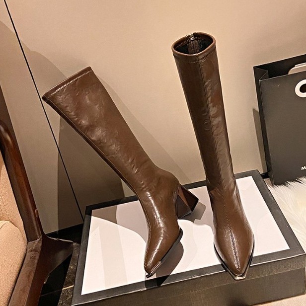2024新型秋冬pu皮ブーツ女性ブーツの先の太さと小さいサイズの騎士ブーツの高いブーツの茶色の黒い色