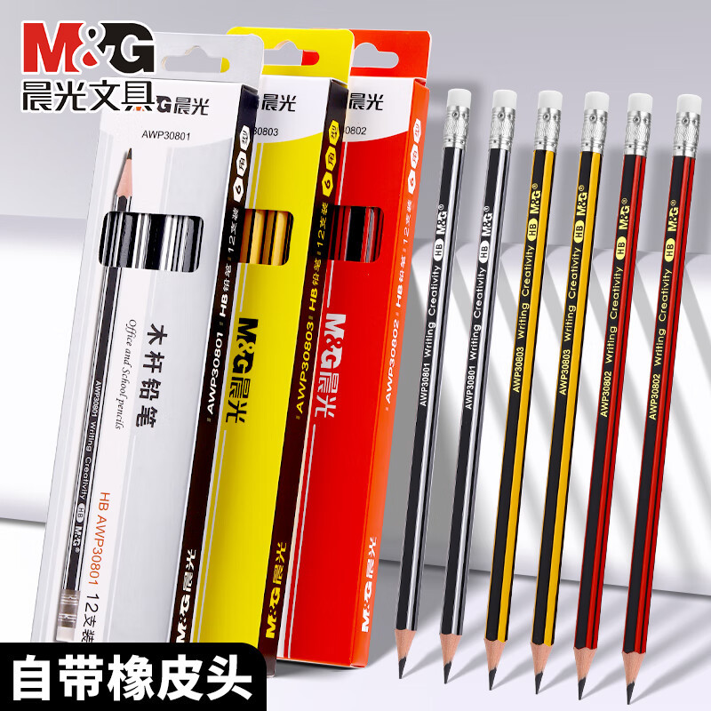 晨光AWP30801木杆铅笔HB六角杆银抽条带橡皮学生文具不易断铅