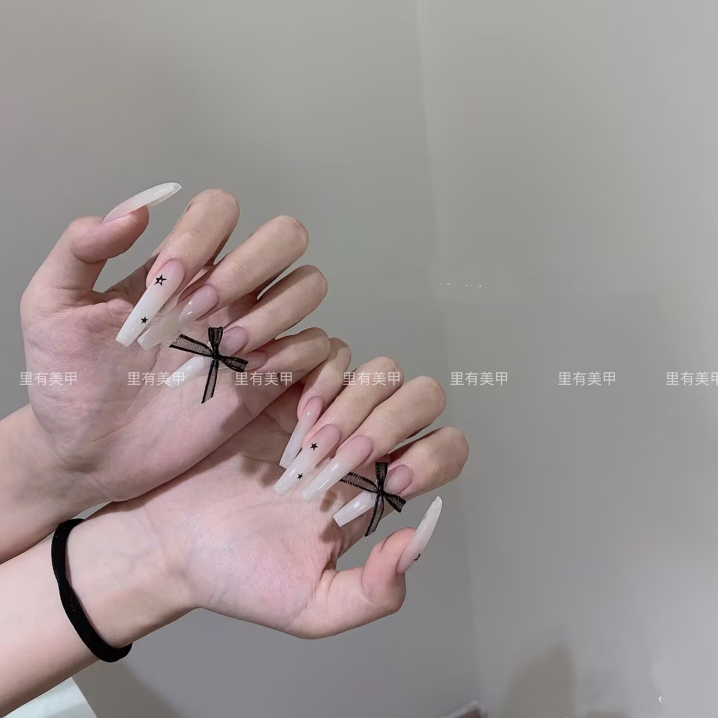 卸売432ハイエンドアイス透明ブラックレースフレンチリボンフェアリーネイルに純粋な手作りのウェアラブルマニキュアが含まれています