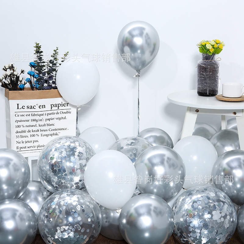 ヘリウム窒素風船が空に漂って白い金属の銀色のスパンコールの蒸気のボールが結婚する部屋の誕生日会の子供のシーンの配置を求めます。
