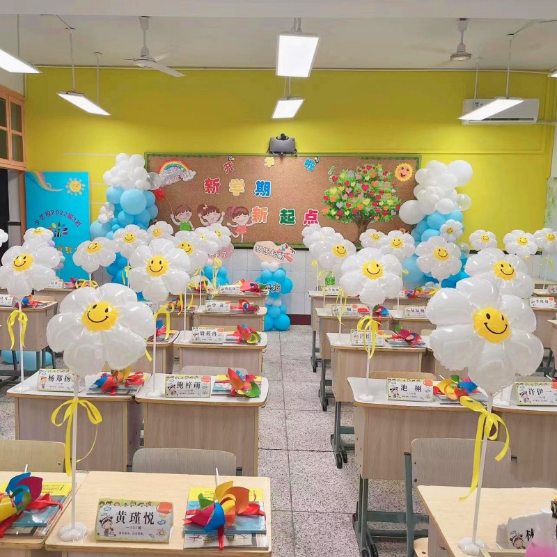 六一子供の日の教室のデスクトップの机は漫画のデイジーの風船を漂って幼稚園の学校を飾って入学して卒業して配置します。