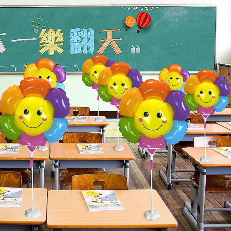 卒業装飾テーブルに太陽が漂っている風船のテーブルの上に幼稚園の小学校の教室の雰囲気を飾っています。