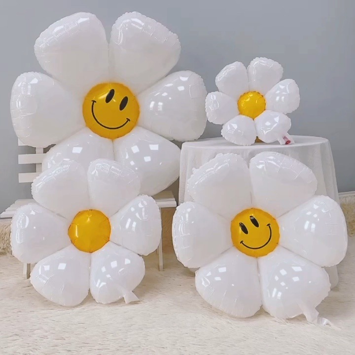 白い小さい菊のアルミニウムの膜の風船の誕生日は六一子供の日の幼稚園を飾ります。
