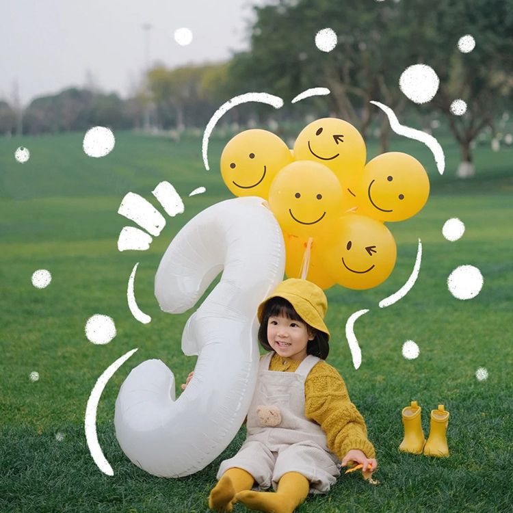屋外の笑顔の数字の風船の誕生日の装飾のシーンは子供の男の子と女の子の赤ちゃんの2歳の3パーティーを手配して写真を撮ります。