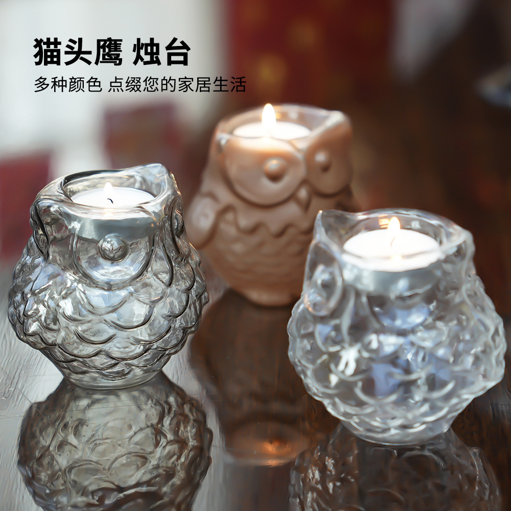クリエイティブヨーロッパ風フクロウカラー燭台透明ガラス燭台キャンドルディナー家庭装飾置物