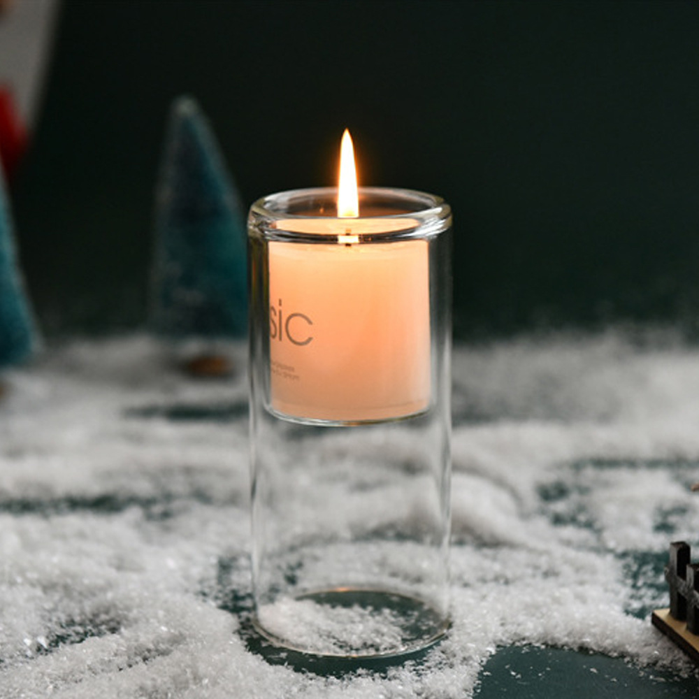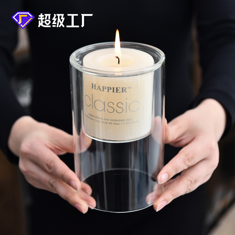 ヨーロッパ式透明ガラス燭台二重ろうそくカップ透明レトロ家庭用ガラスろうそく台中国式置物