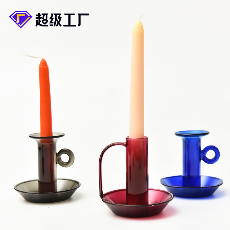 ヨーロッパ式カラーガラス燭台円形取っ手付き燭台透明レトロ家庭用燭台中国式置物