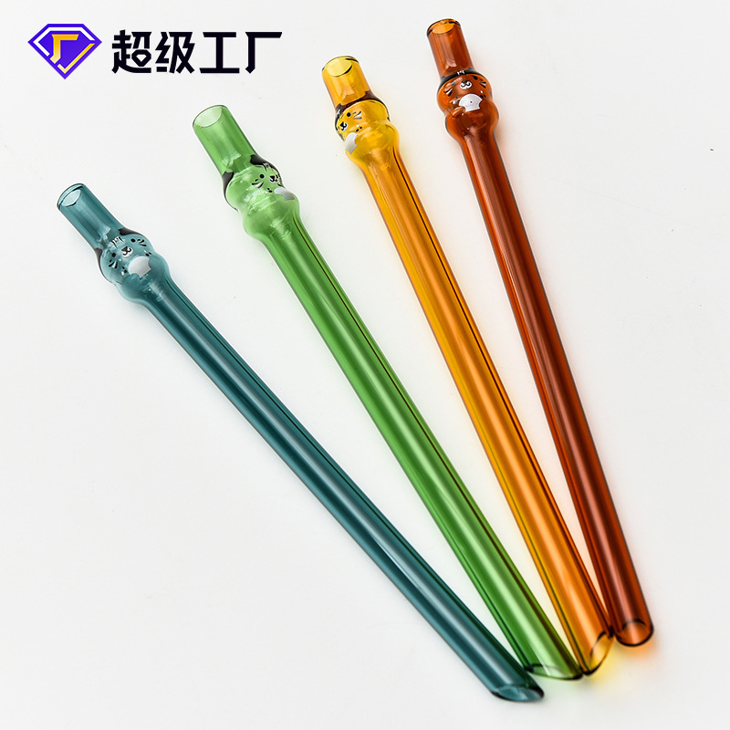クリエイティブモデルの黒熊石虎の形がかわいいガラスストローカラー耐高温ミルクティージュースの尖ったストロー