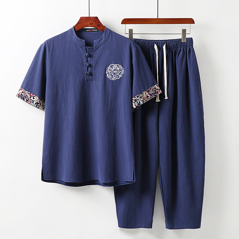 リネンスーツメンズ夏服メンズ半袖Tシャツ大きいサイズゆったり中国風紳士服トレンド綿とリネンの夏服