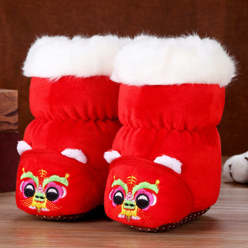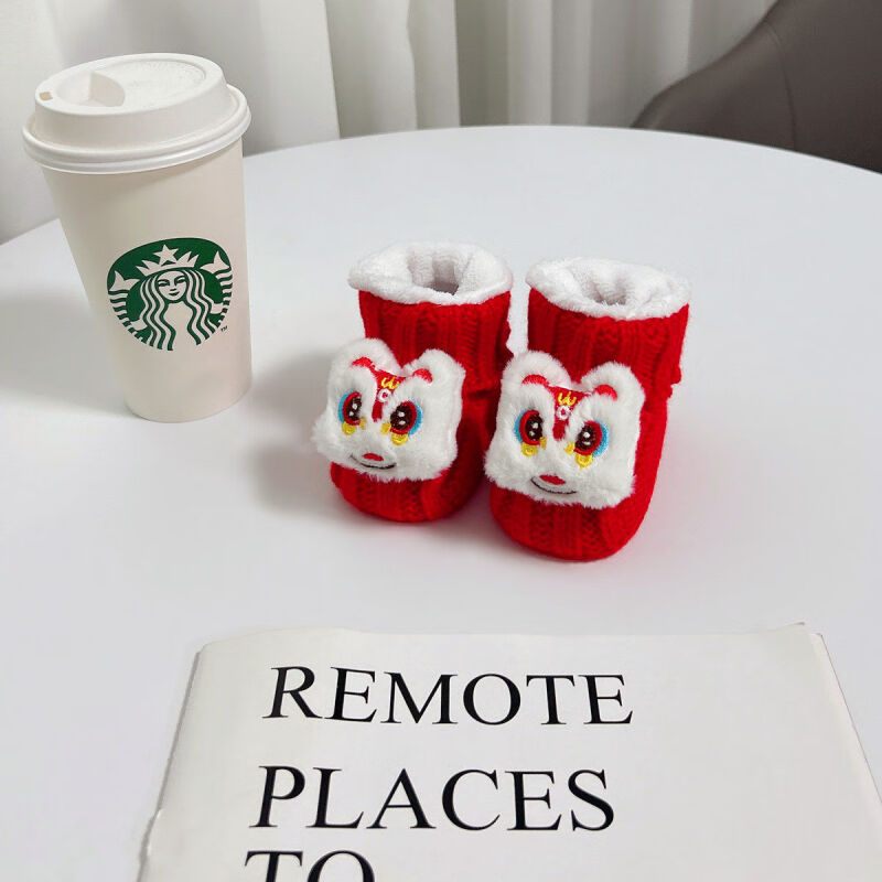冬の赤ちゃんの毛糸靴にベルベットをつけて保温した新生児の手で虎頭靴の赤い靴を編む