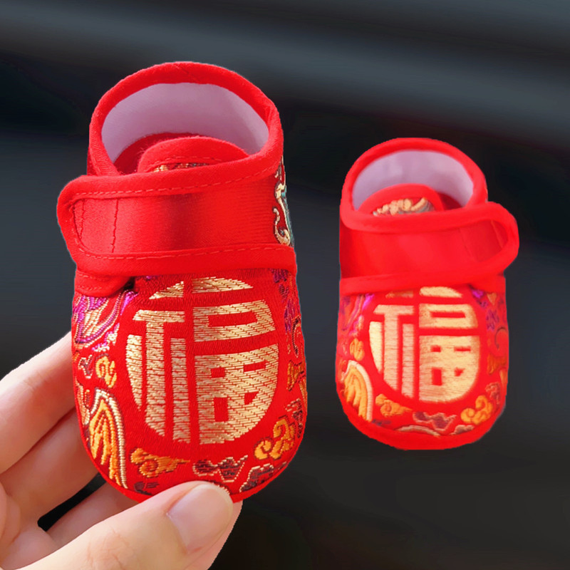 1歳の男性の赤ちゃんの中国式の唐装の靴の赤い百日の宴会の誕生日は周の靴の女性の赤ちゃんの柔らかい底の学歩の靴をつかみます。