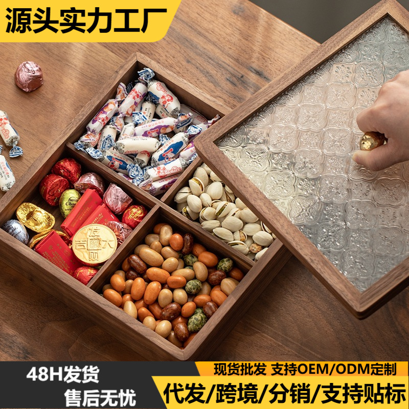 実木ドライフルーツ箱卸売り蓋付き四角いフルーツ皿客間新年キャンディーナッツ箱ガラス収納箱