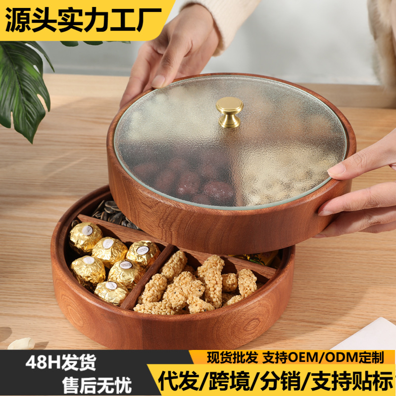 実木ドライフルーツ箱蓋付き円形フルーツ皿家庭用スナックキャンディーナッツ箱多層重ね収納ケース