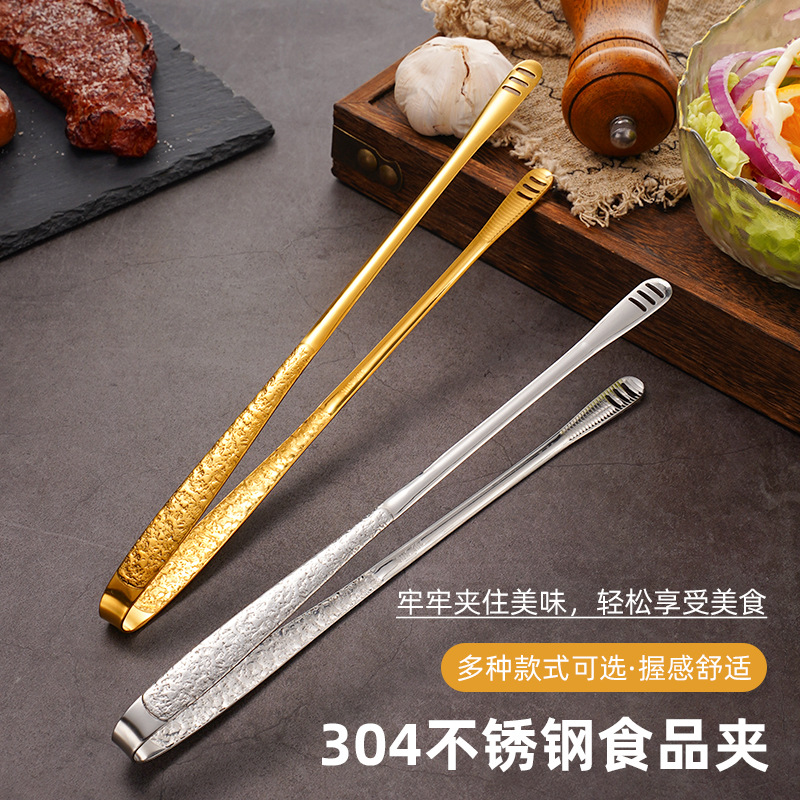 新しい304ステンレスのドリルの滑り止め焼肉の挟みは金色のステーキのバイキングの韓国式パンの食品の挟みを延長します。