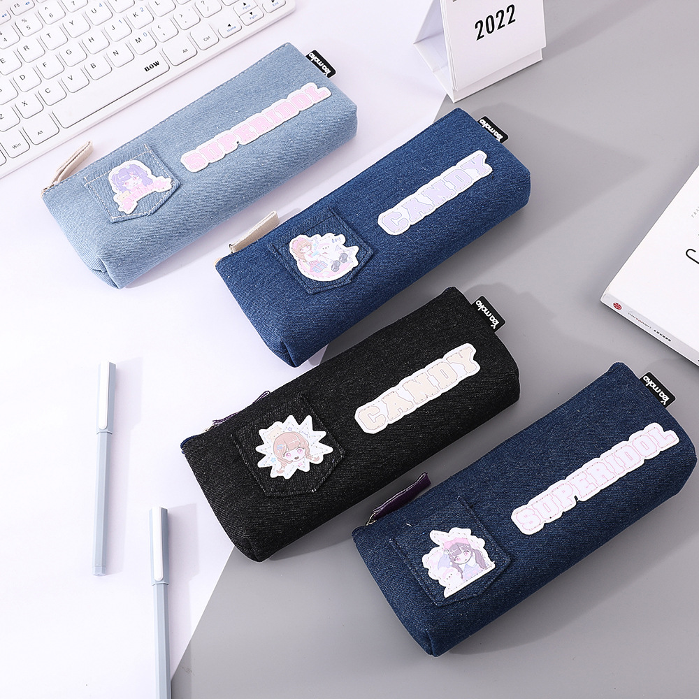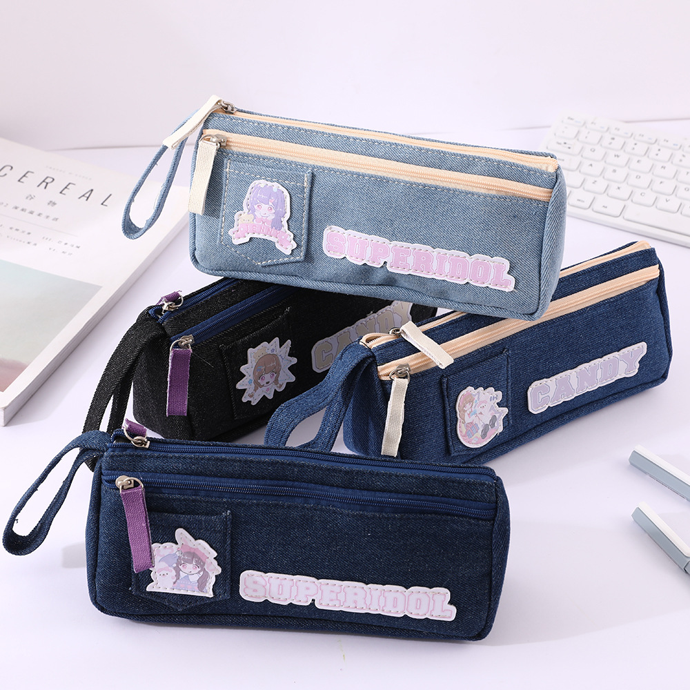 Insネット紅文房具袋学生創意可愛いシンプルデニム大容量ペン袋多機能二重鉛筆ケース
