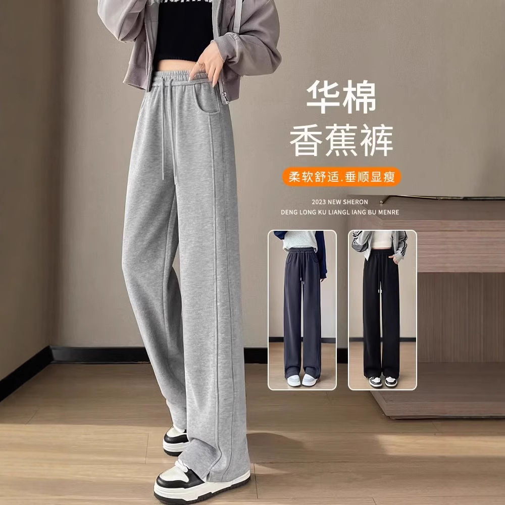 狭い版の広腿のズボンの女性の春秋2025新型のカジュアルなストレートの小さい体の運動のズボンとベルベットの外はバナナの衛のズボンを着ます。