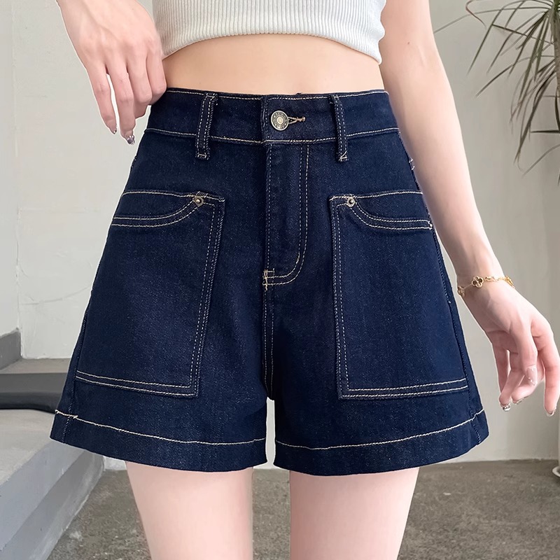 ダークブルーのストレッチデニムショートパンツ女性用 2025 夏薄い小柄なルーズ A ラインハイウエスト 3 点ホットパンツ
