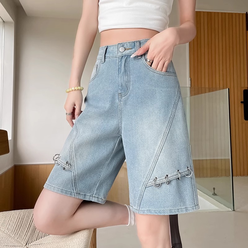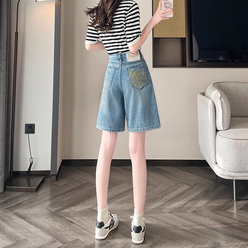 ライトブルー刺繍入り5点デニムショートパンツ女性用2025夏薄手ゆったり小柄国民風5点パンツ