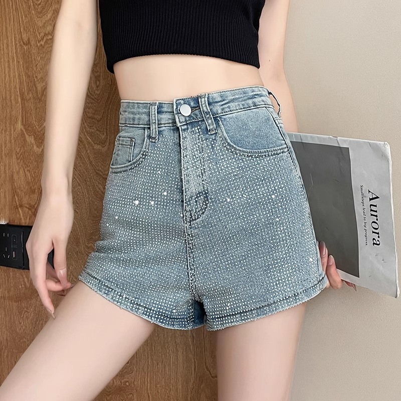 フラッシュダイヤモンドデニムショートパンツ女性のための 2025 夏薄い A ライン弾性ハイウエストヒップダイヤモンドヘビーデューティホットガールホットダイヤモンドホットパンツ