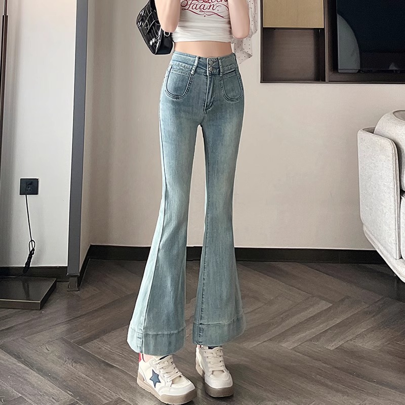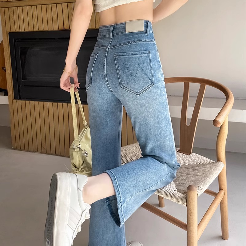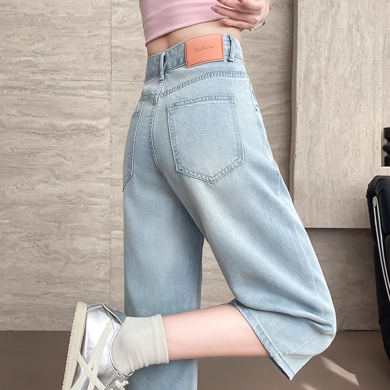 レトロなマイクロラップジーンズの女性2025夏の薄いタイプの高腰修身の小さい背は腹を収めて広い足の馬蹄のトランペットのズボンを収めます。