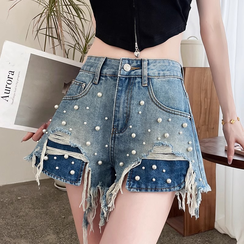 レトロな真珠のデニムのショートパンツの女性2025夏の薄いタイプの高腰のデザイン感の釘の玉の穴のa字のギャルの熱いズボン