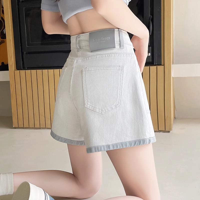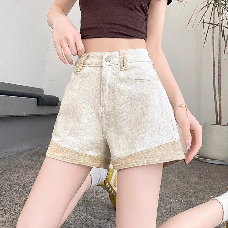 ベージュのデニムのショートパンツの女性2025夏の薄い弾力性のある色のつなぎ合わせa字4分のズボンの色合わせのギャルのホットパンツ