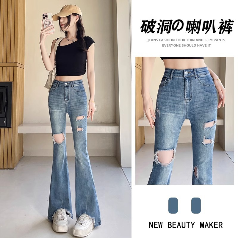レトロな穴の小さいラッパのジーパンの女性2025夏の薄いタイプの腰の小さい体は不規則なラッパのズボンを修理します。