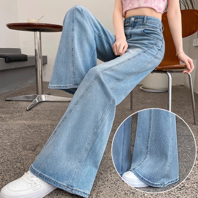 水色の満天の星はドリルの広い足のジーパンの女性の2025夏の薄い金のゆったりしている大きい足の天糸にアイロンをかけてズボンを引きずります。