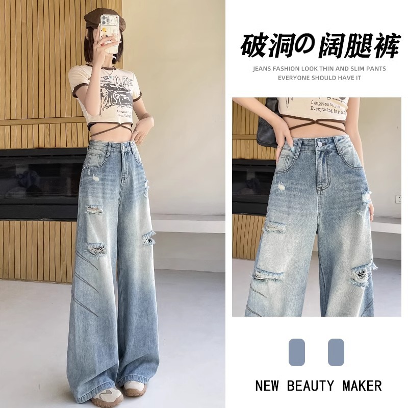 アメリカのレトロな穴の広い足のジーパンの女性2025夏の薄いタイプのゆったりしたデザイン感の高い街のモップのズボン