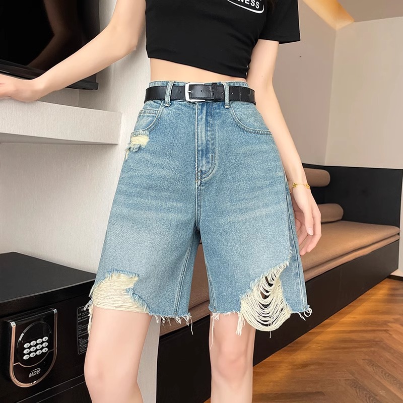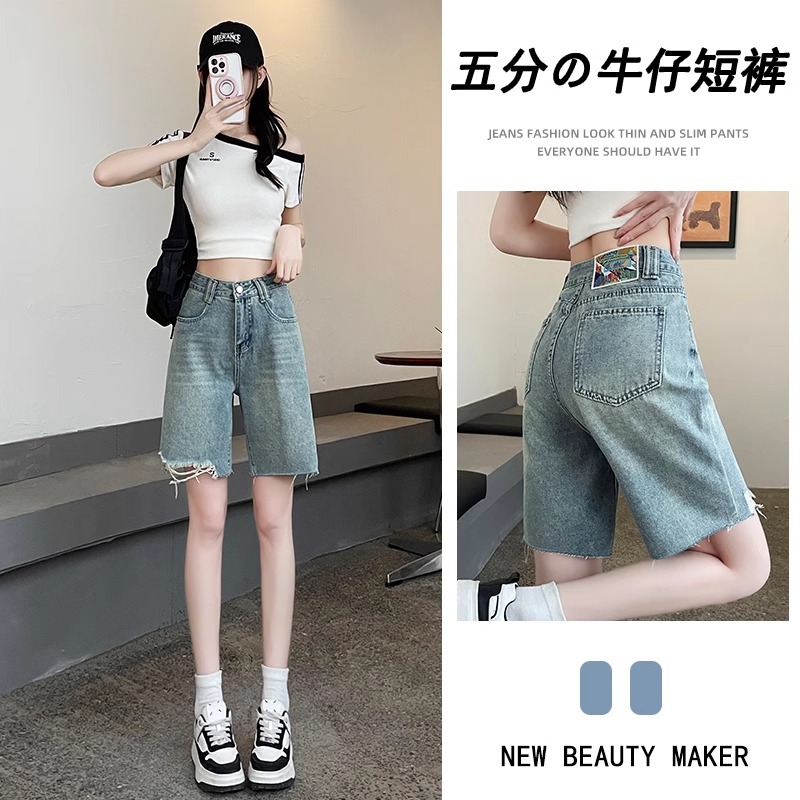 バリの穴が開いている5分のデニムの半ズボンの女性2025夏の薄いゆるいナシの形の体つきはやせているa字の5分のズボンの中でズボンを現します。