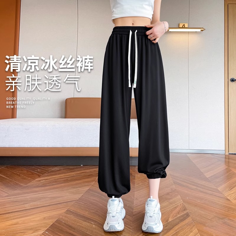 氷糸スポーツパンツ女性夏の薄手2025新黒色ゆるい足首ズボン夏の通気性カジュアルパンツ