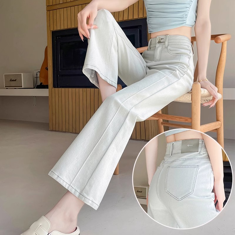 女性用ベージュフレアジーンズ2025夏薄いサイドステッチ小柄な9点小さなフレア8点パンツ