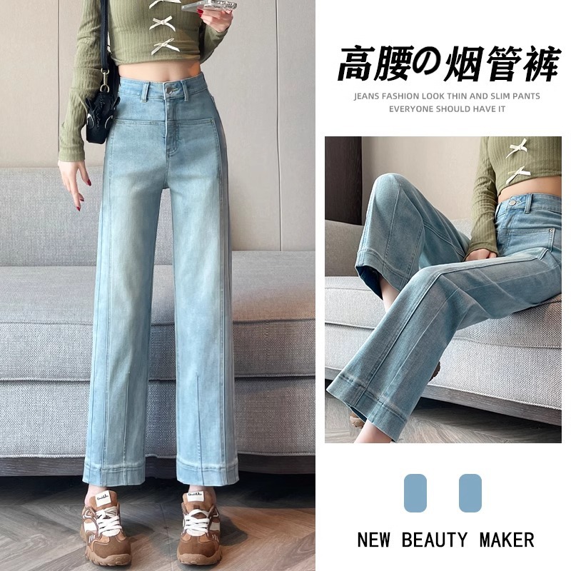 水色の狭い版のタバコの管のジーパンの女性の2025春の新型の高い腰の小さい背の弾力の法の棒のストレートなズボン