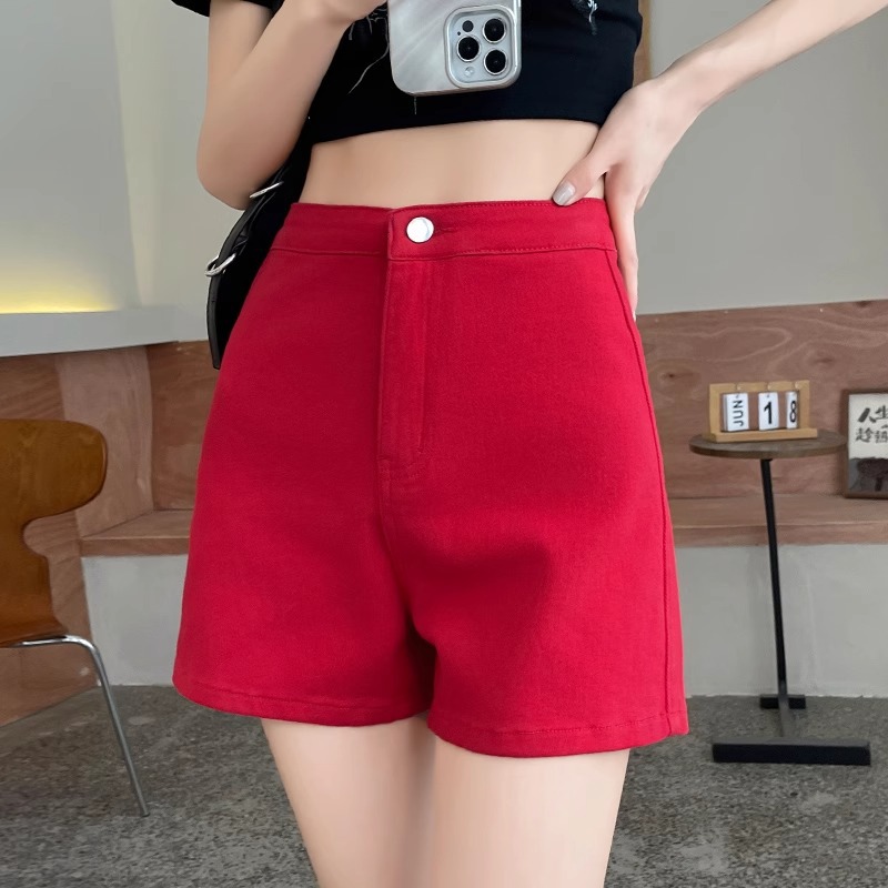 赤いデニムの半ズボンの女性2025夏の新型の高腰のタイトな小さい体のカラーの4分のストレートのズボンの外で着ます。