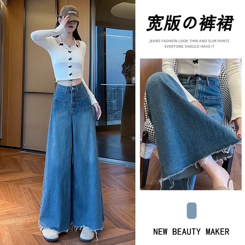 毛の縁のゆったりした広脚の大きいラッパのジーパンの女性の2025春の服装のナシの形の体形のスカートのズボンは股を遮って足のズボンのスカートを貼りません。
