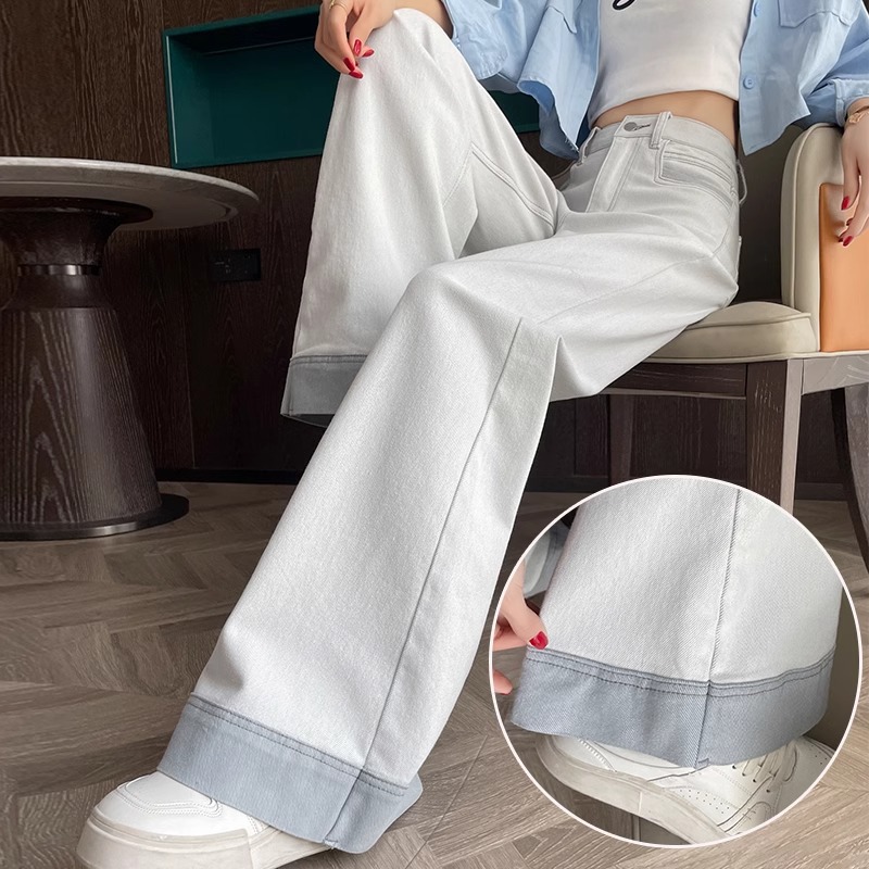 色のジーパンの女性の2025春のまっすぐな筒の広い足のナシの形の体つきはやせていて色の小さい背の白い9分のズボンをつづり合わせます。