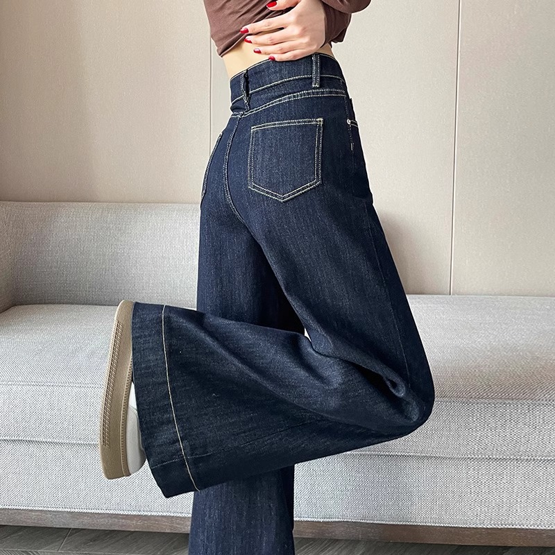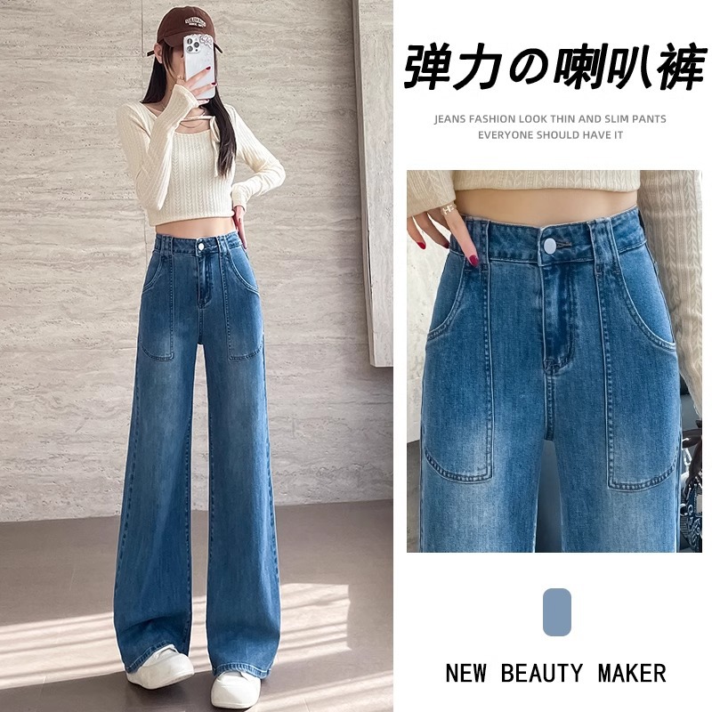 弾力的な広脚の微ラッパジーパンの女性2025年の春は梨の形の体つきのまっすぐな筒のゆったりとしているズボンのラッパのズボンを詰めます。