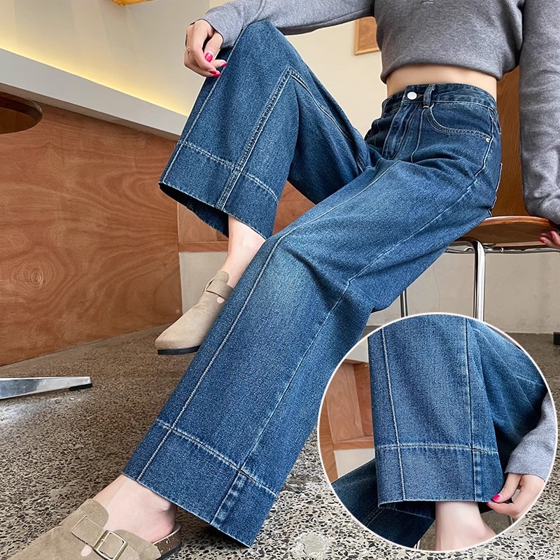 青い広脚ジーンズ女2025年春高腰ゆるい隠れ肉小柄9分おばあちゃんストレートズボン