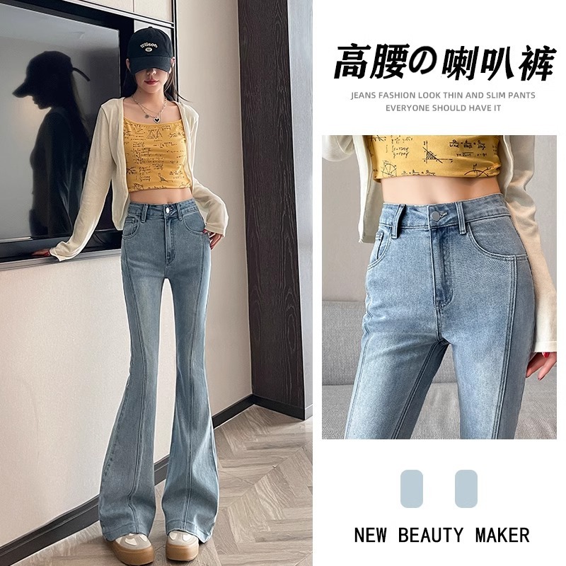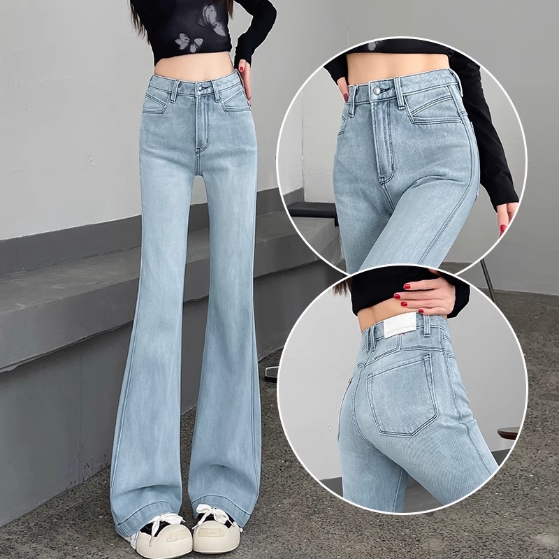 薄い色の微ラッパのジーパンの女性の春の2025新型の高腰の復古の背の高い弾力はやせているラッパの馬蹄のズボンを現します。