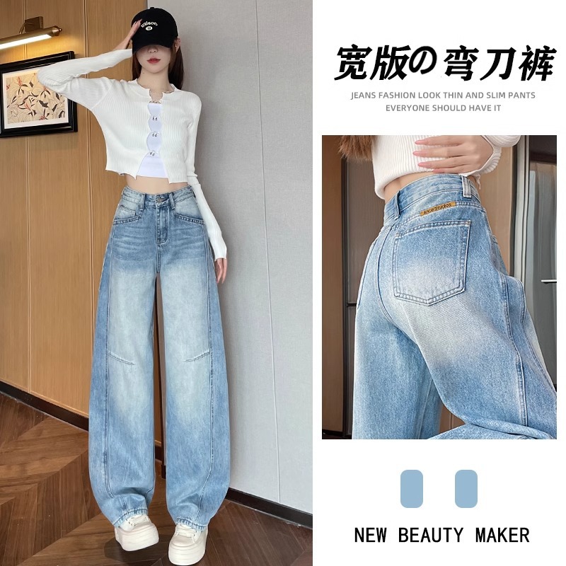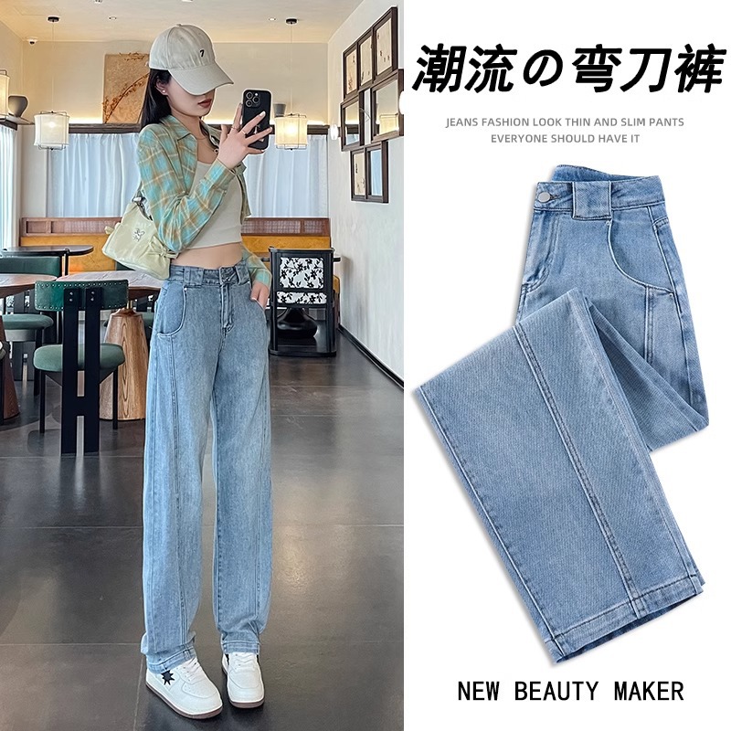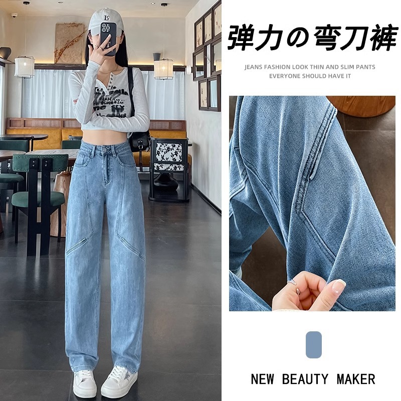空の青いハレンジーンズの女性2025春の服装の弾力性は小さい背の狭い版の曲がった刀のズボンの潮牌の鎌のズボンをつなぎ合わせます。
