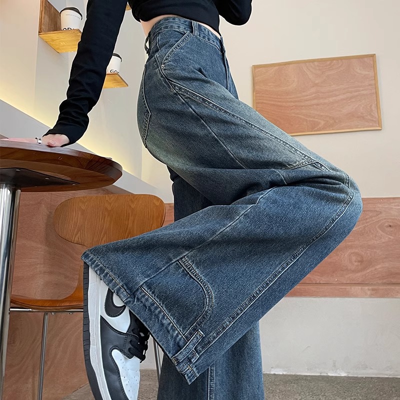 ゆったりとした広脚ジーンズの女性春2025レトロなデザイン感があります。