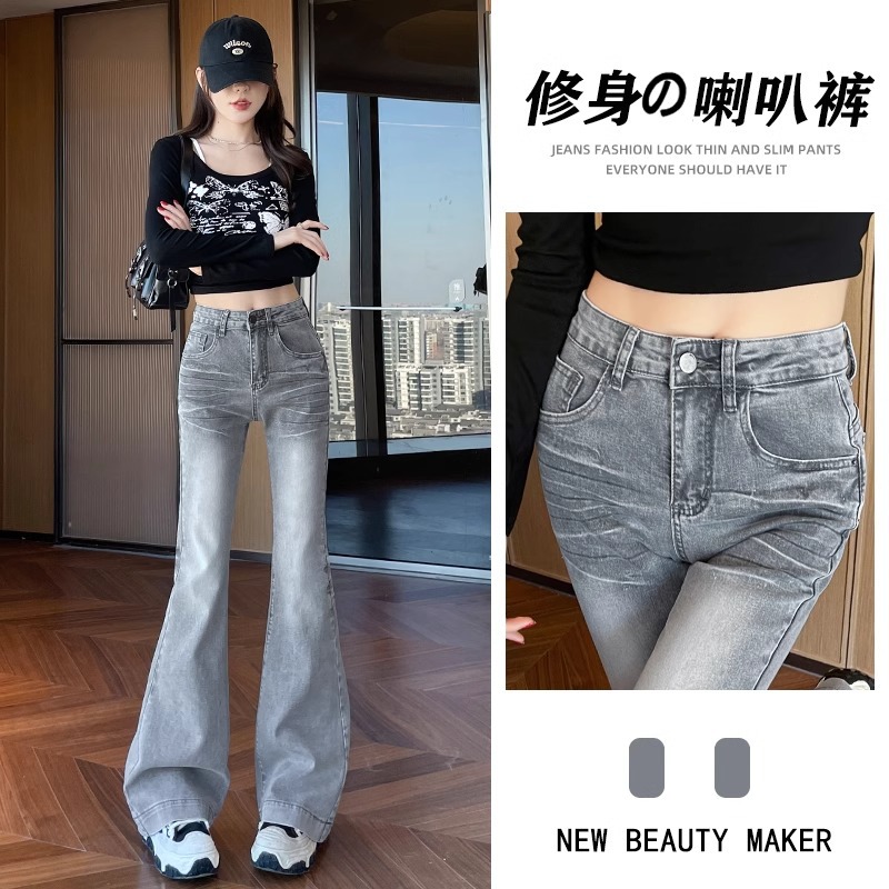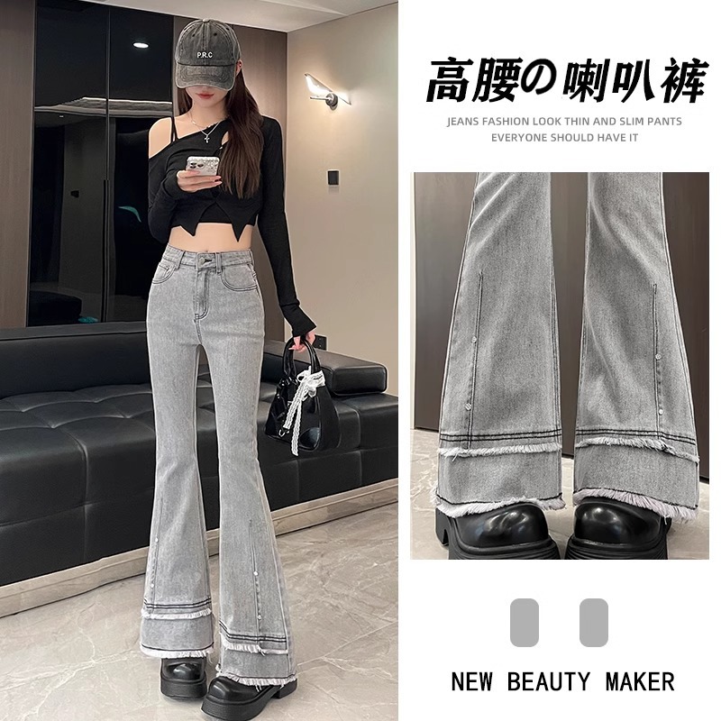 薄い灰色の毛の縁の小さいラッパのジーパンの女性の2025年の春の新型の高い腰の修身は尻の馬蹄のスピーカーのズボンを持ちます。