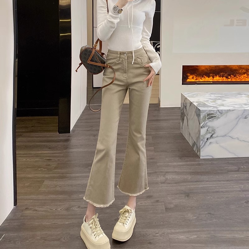 薄い色の毛の縁の小さいラッパのジーパンの女性の春の2025新型の高腰の小さい背のまっすぐな筒の小さいラッパの9分のズボン
