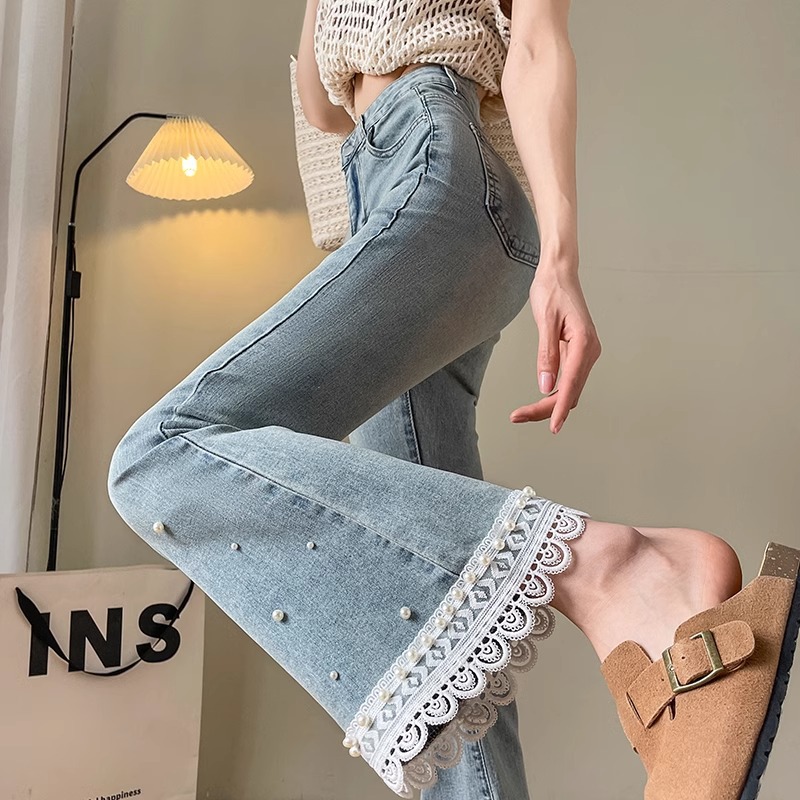 レトロな真珠のレースの小さいラッパのジーパンの女性の2025春の流行の小さい背の8分の9分の修身のラッパのズボン
